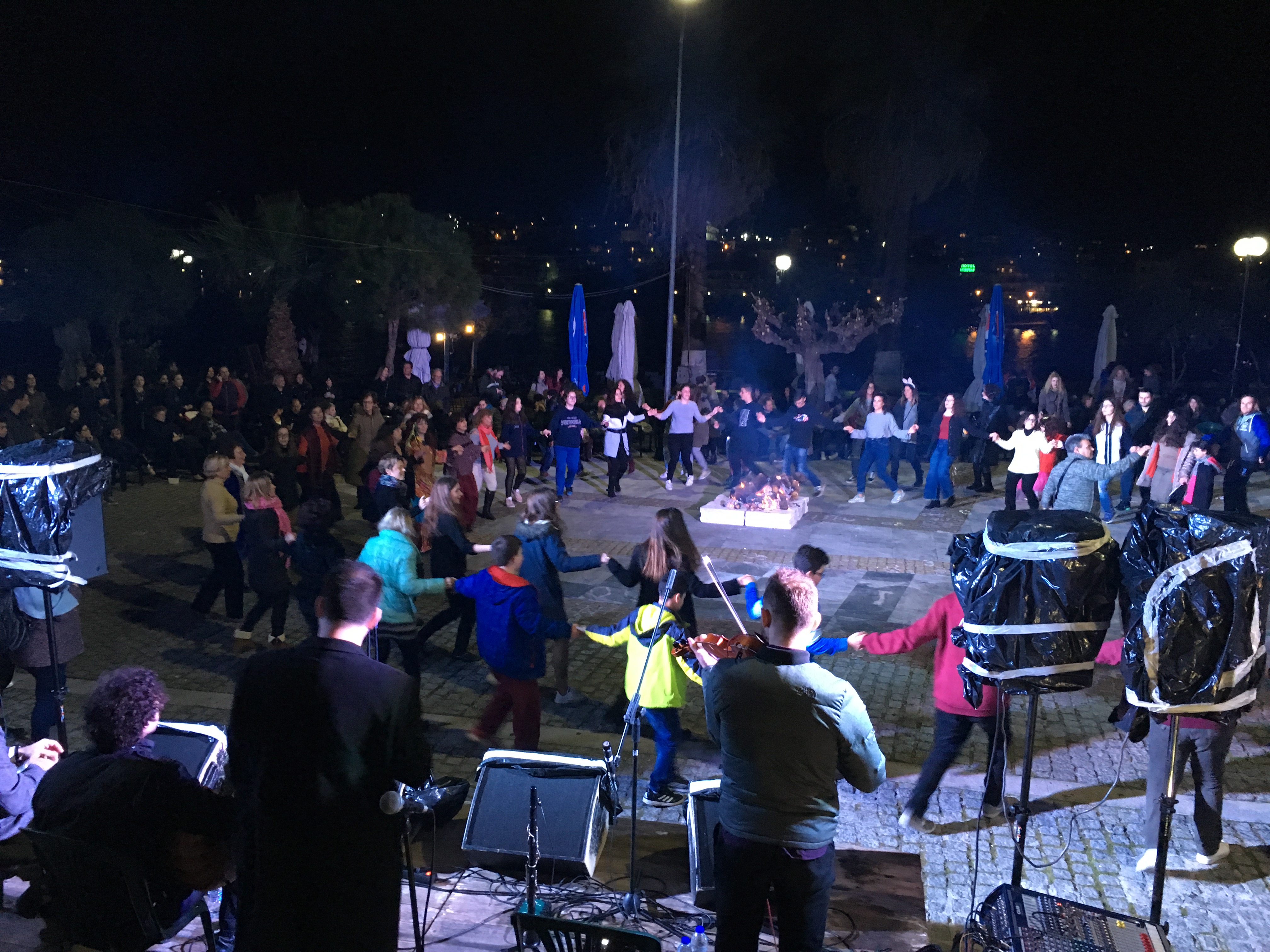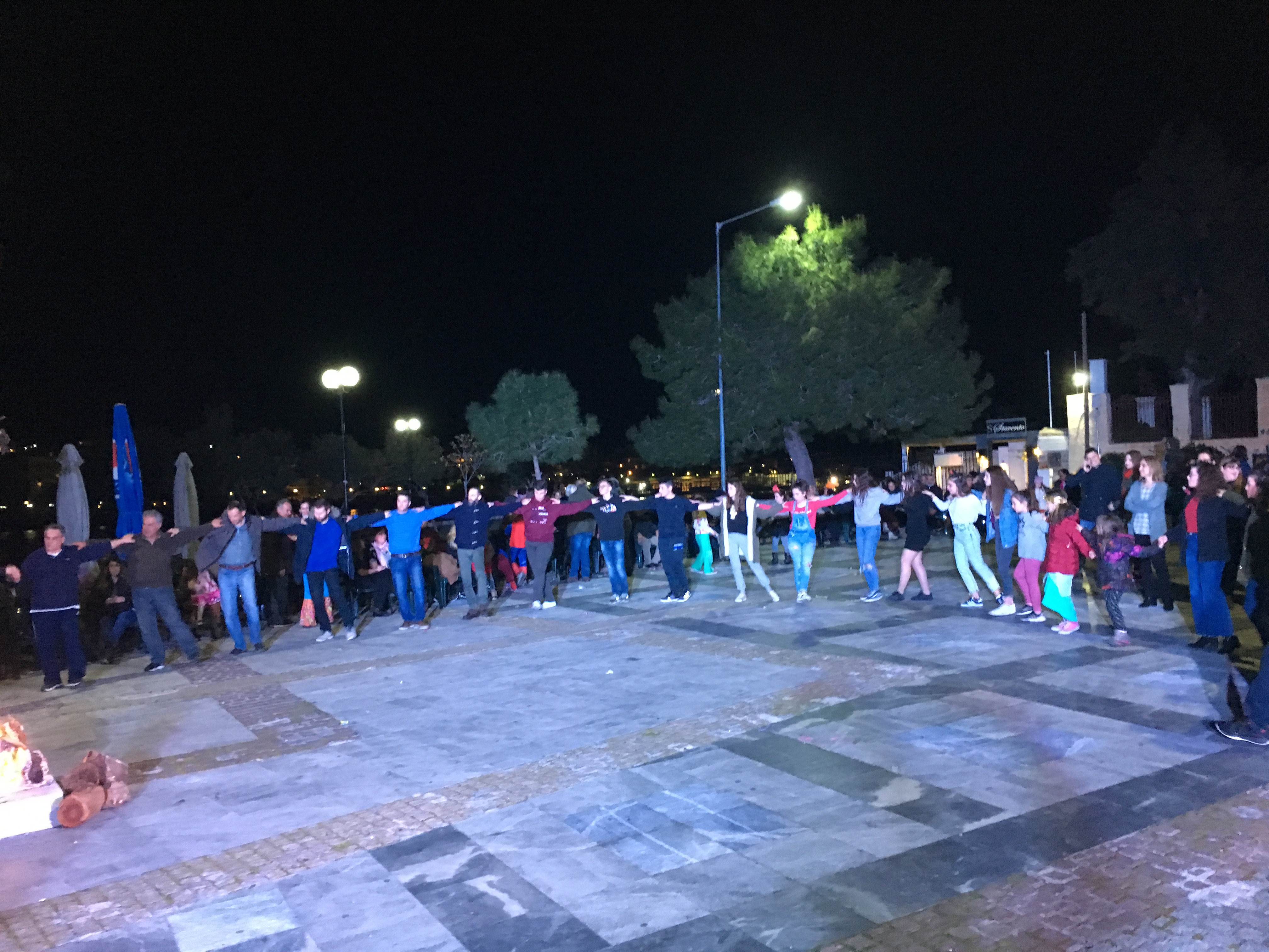 Άφθονο κρασί και σουβλάκια προσφέρθηκαν στον κόσμο και οι φωτιές που άναψαν στην πλατεία, ζέσταναν κι άλλο τη βραδιά.