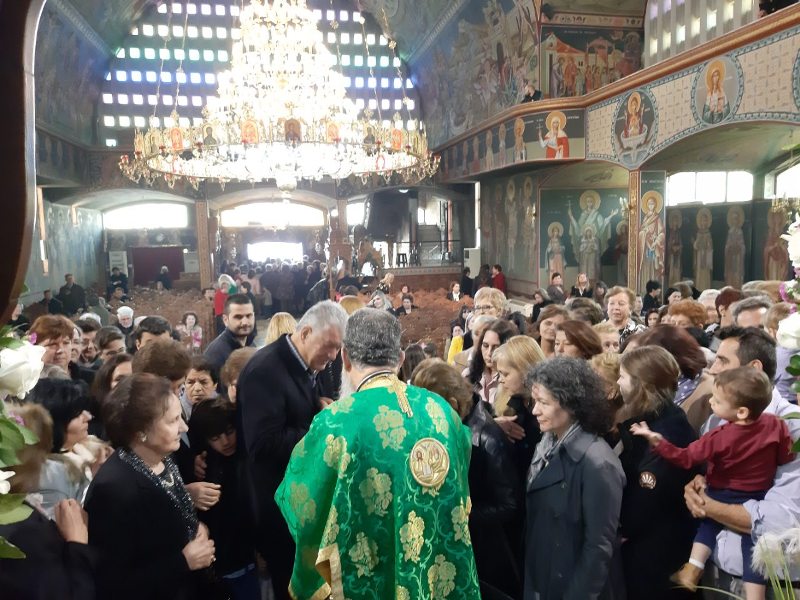 Ο Σεβασμιώτατος Μητροπολίτης Χαλκίδος κ. Χρυσόστομος πλαισιωμένος από τον Αρχιγραμματέα της Ιεράς Συνόδου της Εκκλησίας της Ελλάδος Αρχιμ. Φιλόθεο Θεοχάρη, τον Πρωτοσύγκελλο της Ιεράς Μητροπόλεως Αρχιμ. Νικόδημο Ευσταθίου, τον Ιεροκήρυκα Αρχιμ. Ιωάννη Καραμούζη, τον Προϊστάμενο της Ενορίας Αγ. Αποστόλων Ν. Αρτάκης Αρχιμ. Στέφανο Καραμούζη, τον Πρωτ. Δημήτριο Γροντή και τον Διάκ. Ευγένιο Τσάλλα, προέστη των Ιερών Ακολουθιών στην προαναφερθείσα Ενορία, όπου είχαν προσέλθει από νωρίς στον Όρθρο και συμμετείχαν πληθωρικά στο κοινό Ποτήριο εκατοντάδες πιστοί και κυρίως νέοι, εκ των οποίων πολλοί μαθητές που διακονούν στο ιερό βήμα και στα αναλόγια, απήγγειλαν το Σύμβολο της Πίστεως και την Κυριακή Προσευχή.