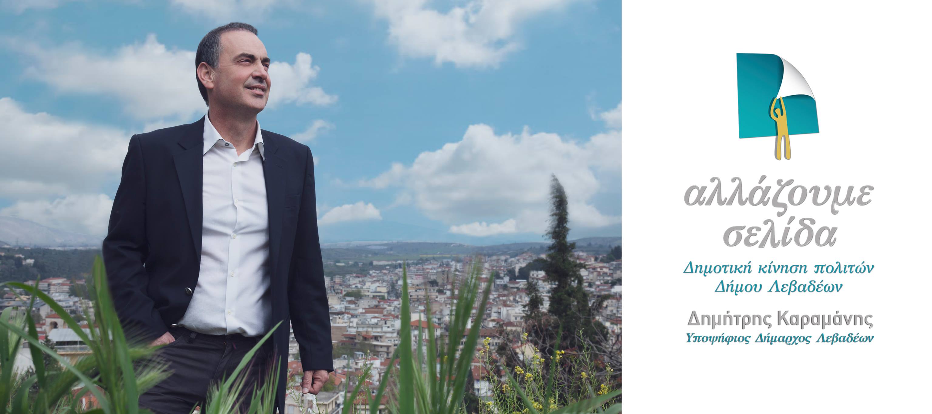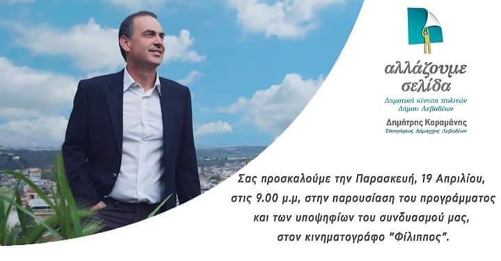 Την Παρασκευή, 19 Απριλίου, στις 9:00 μ.μ, θα πραγματοποιηθεί η παρουσίαση του προγράμματος και των υποψηφίων του συνδυασμού ΑΛΛΑΖΟΥΜΕ ΣΕΛΙΔΑ με επικεφαλής τον Δημήτρη Καραμάνη, για τη διεκδίκηση του Δήμου Λεβαδέων.