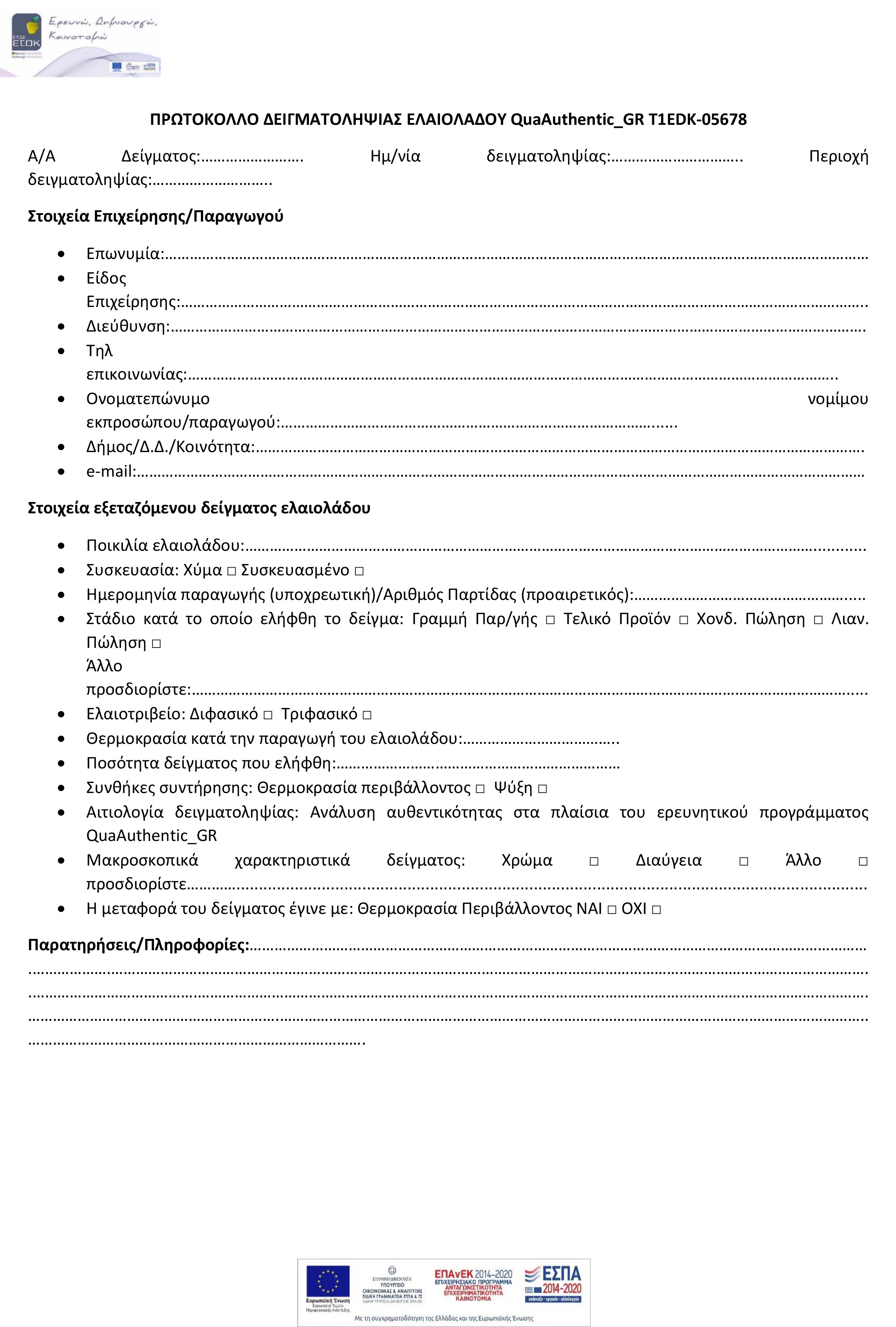 Στο νέο ερευνητικό πρόγραμμα με ακρώνυμο QuaAuthentic_GR, συμμετέχουν επίσης το Τμήμα Επιστήμης Τροφίμων και Διατροφής του Ανθρώπου του Γεωπονικού Πανεπιστημίου Αθηνών με Επιστημονικό Υπεύθυνο τον Καθηγητή και Πρόεδρο του Τμήματος κο Πέτρο Ταραντίλη, η Εταιρεία – Εργαστήριο Ποιοτικού Ελέγχου ΕΡΓΑΝΑΛ και η Επαγγελματική Οργάνωση Ελαιόλαδου ΣΕΒΙΤΕΛ.