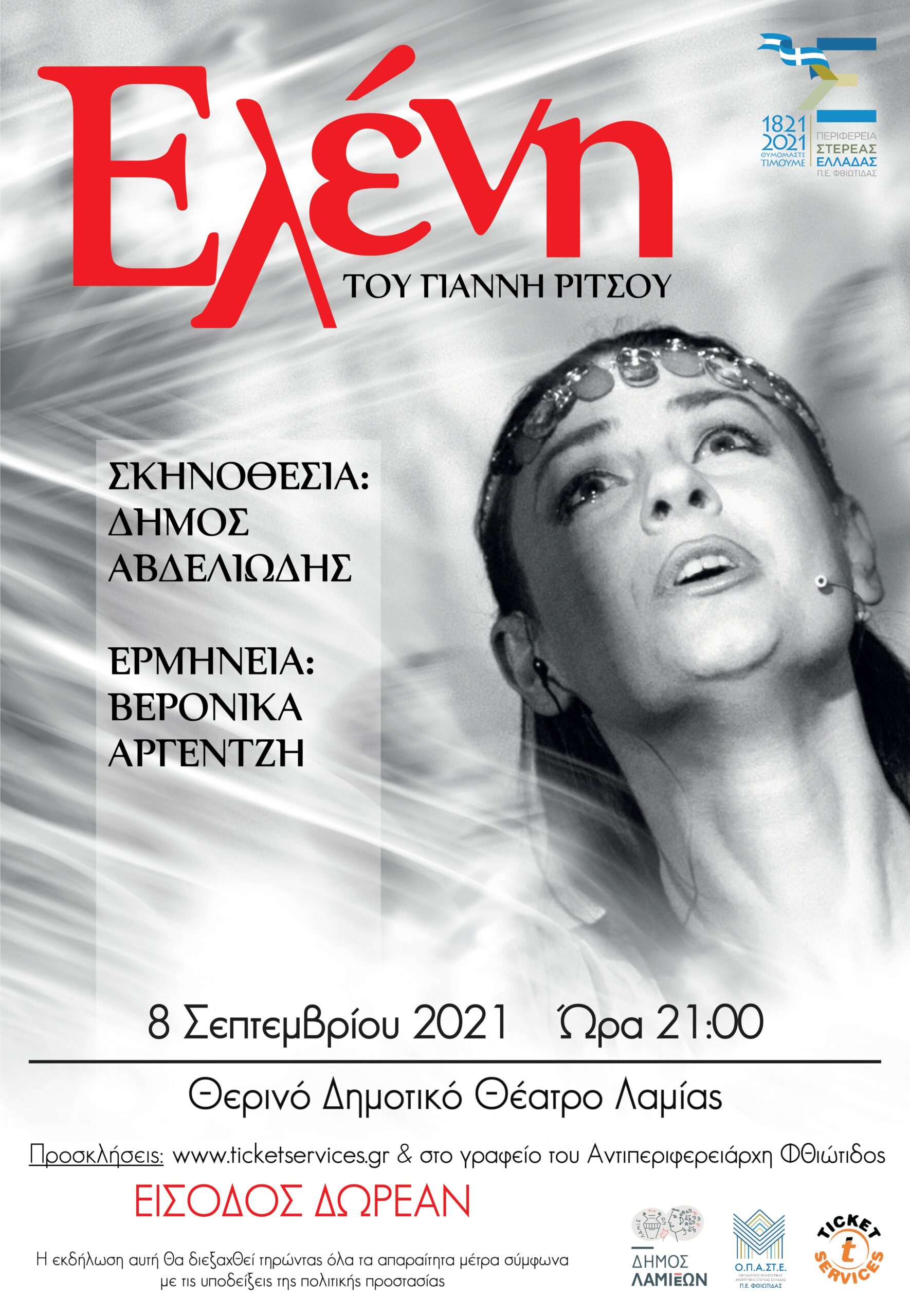Η Περιφερειακή Ενότητα Φθιώτιδας προσκαλεί στην παράσταση με τίτλο «Ελένη» του Γ. Ρίτσου στο Θερινό Δημοτικό Θέατρο Λαμίας με ελεύθερη είσοδο.