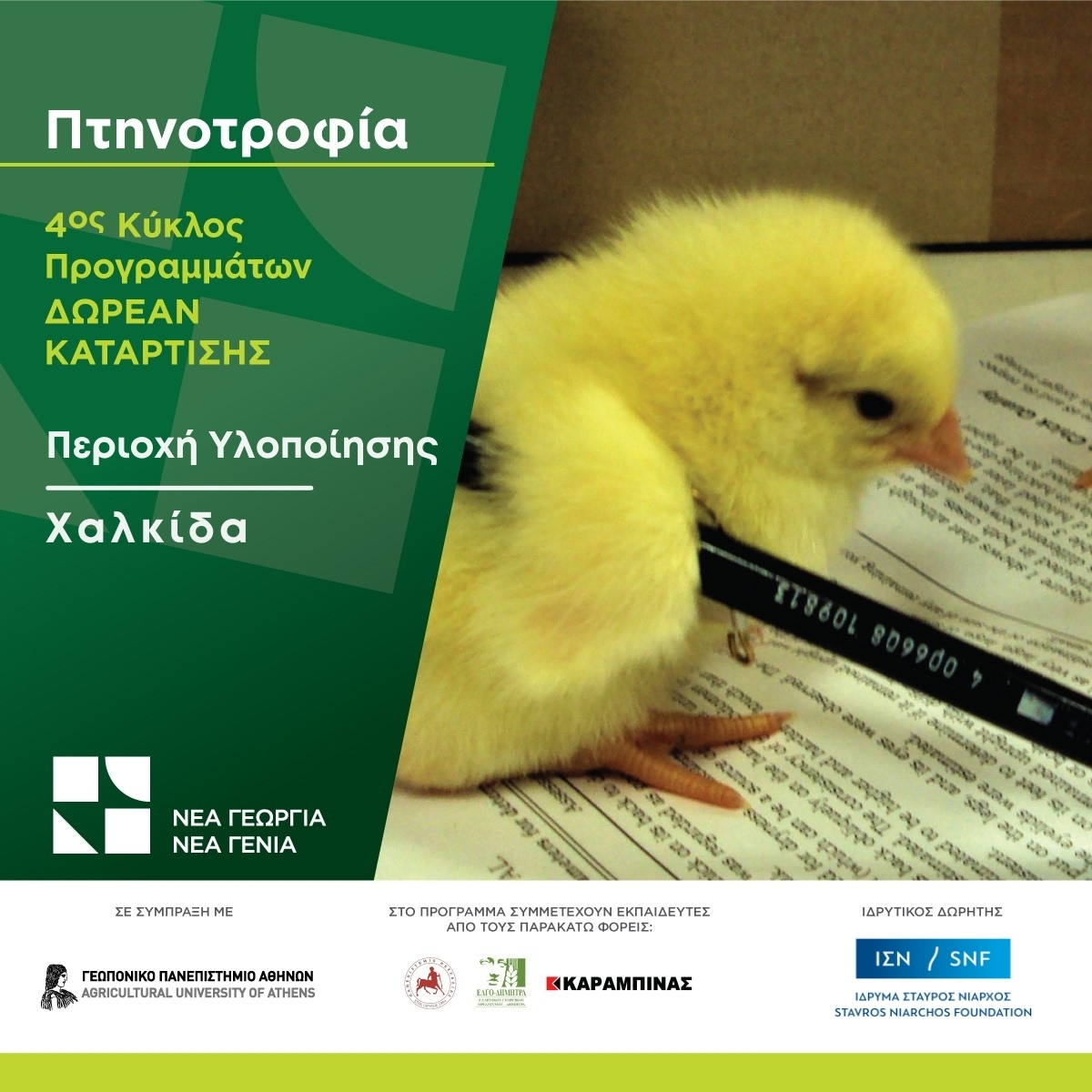 O Οργανισμός «Νέα Γεωργία Νέα Γενιά», σε συνεργασία με το Γεωπονικό Πανεπιστήμιο Αθηνών (ΓΠΑ) προσφέρουν δωρεάν πρόγραμμα κατάρτισης και συμβουλευτικής με θέμα «Κρεοπαραγωγός Πτηνοτροφία».
