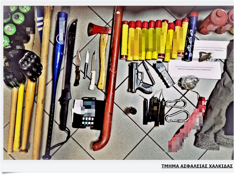 Κατασχέθηκαν κάνναβη, ρόπαλα, τσεκούρι, μαχαίρι, σουγιάδες, συσκευή ηλεκτρικής εκκένωσης, πιστόλι – στυλό, αεροβόλο πιστόλι, φωτοβολίδες, κροτίδες, καπνογόνα, σπρέι πιπεριού, οχήματα κ.α.