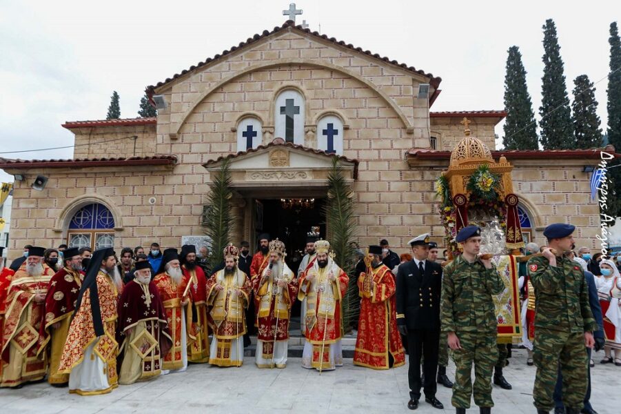 Η Ιερά Λιτανεία έκλεισε με τον Εθνικό Ύμνο, τον οποίο παιάνισε η Δημοτική Φιλαρμονική και έψαλλαν με συγκίνηση όλοι οι παρευρισκόμενοι.