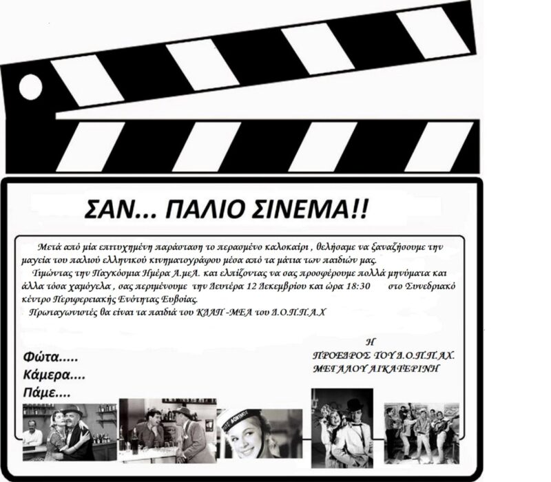 Ο Δημοτικός Οργανισμός Παιδείας, Προστασίας και Αλληλεγγύης Χαλκίδας (Δ.Ο.Π.Π.Α.Χ.) και τα παιδιά των Κέντρων Δημιουργικής Απασχόλησης Ατόμων με Αναπηρία (Κ.Δ.Α.Π ΜεΑ) προσκαλούν στη μουσικοθεατρική παράσταση «Σαν παλιό σινεμά», που θα πραγματοποιηθεί τη Δευτέρα 12 Δεκεμβρίου 2022 και ώρα 18:30, στο Συνεδριακό Κέντρο της Περιφερειακής Ενότητας Εύβοιας (Λ. Χαϊνά 93).
