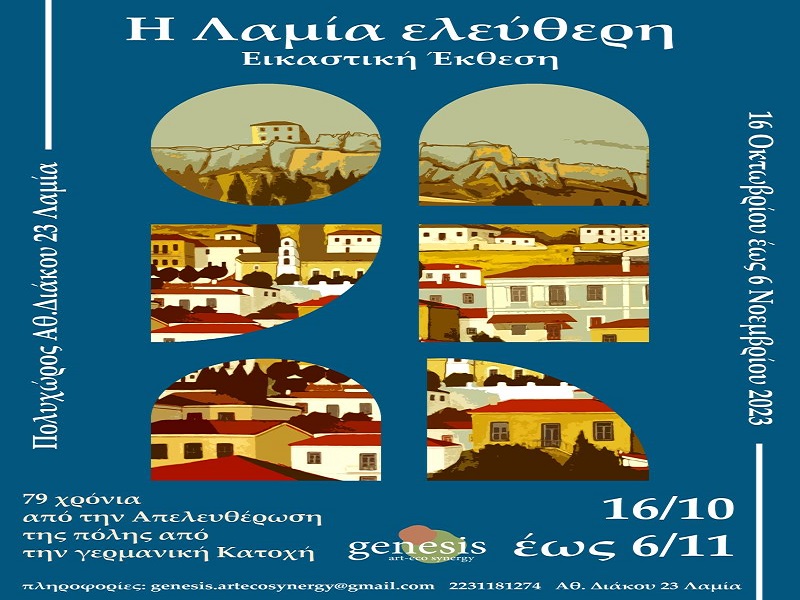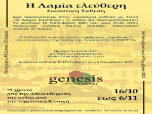 - Με αφορμή την συμπλήρωση των 79 χρόνων από την απελευθέρωση της πόλης της Λαμίας, από την γερμανική Κατοχή, η εταιρεία πολιτισμού Genesis Art-Eco Synergy διοργανώνει μία εικαστική έκθεση φόρο τιμής στην γενέτειρα πόλη μας.