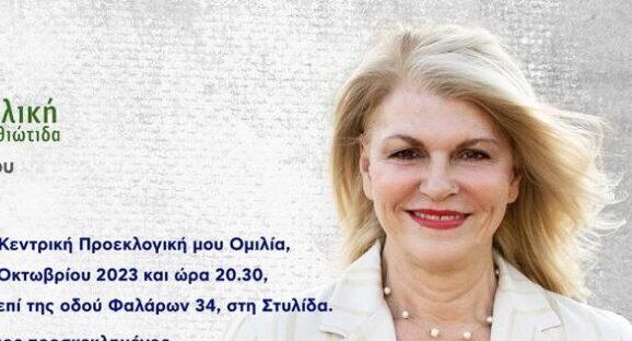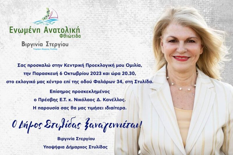 Την Παρασκευή 6 Οκτωβρίου και ώρα 20:30’ θα πραγματοποιηθεί η κεντρική προεκλογική ομιλία της Δημάρχου Στυλίδας και εκ νέου υποψήφιας, στο εκλογικό κέντρο του Συνδυασμού «Ενωμένη Ανατολική Φθιώτιδα» επί της οδού Φαλάρων 34, στη Στυλίδα.