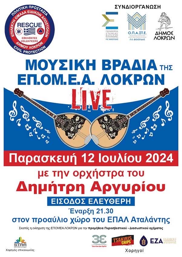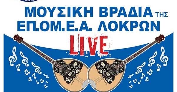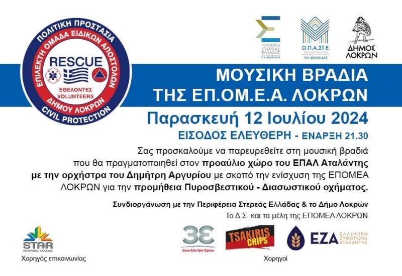 Μουσική Βραδιά της ΕΠ.ΟΜ.Ε.Α Λοκρών θα πραγματοποιηθεί την Παρασκευή 12 Ιουλίου 2024 στις 21:30 στον προαύλιο χώρο του ΕΠΑΛ Αταλάντης.
