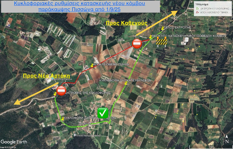 Οι κυκλοφοριακές ρυθμίσεις θα είναι διάρκειας ενός (1) μήνα, εκτός απροόπτων γεγονότων, και κατά την εφαρμογή τους θα γίνεται ευρεία εκτροπή της κυκλοφορίας επί της Ε.Ο 11 (στην 7,5 χ.θ. και για τις δύο κατευθύνσεις) στη περιοχή του υφιστάμενου κόμβου Πισσώνα και εν συνεχεία η κυκλοφορία (και για τις δύο κατευθύνσεις) θα  διεξάγεται μέσω του οικισμού  Πισσώνα και μέσω της οδού που παρακάμπτει τον Πισσώνα βάσει του συνημμένου αποσπάσματος χάρτη που επισυνάπτεται.