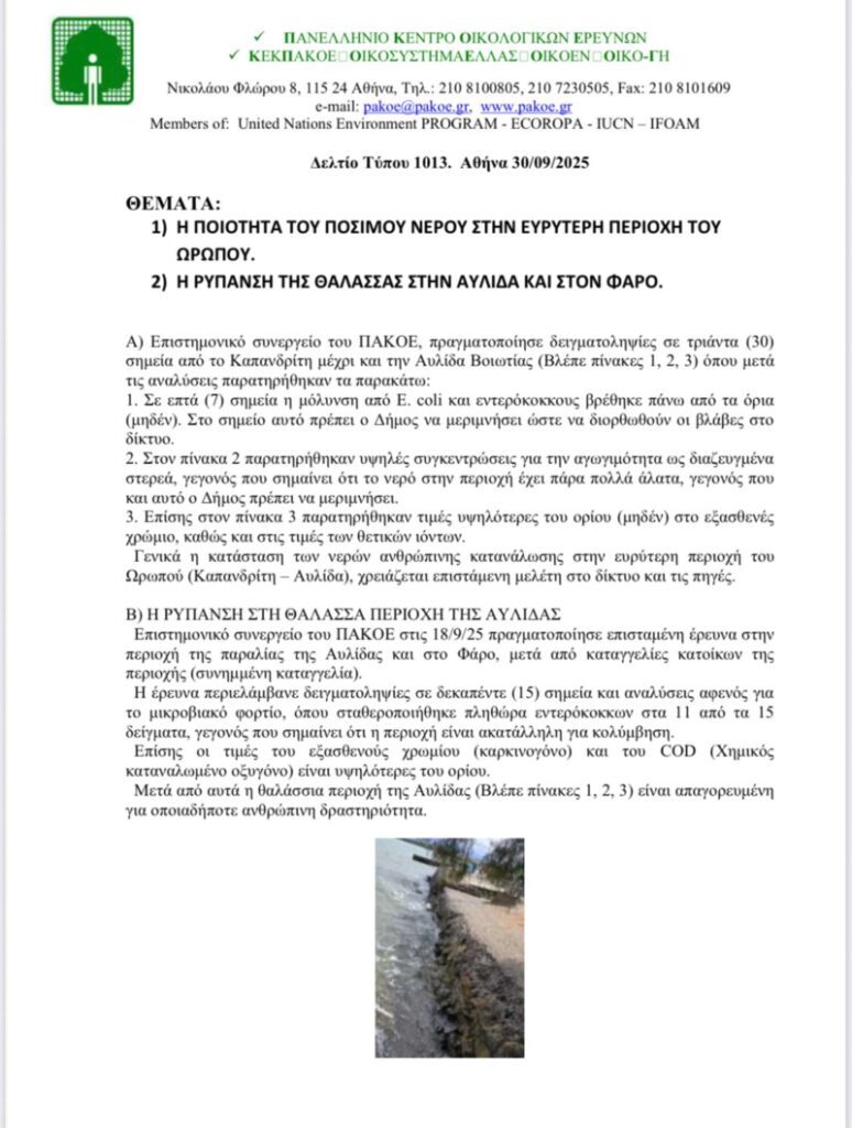 χαρακτηρίζοντας την παράκτια ζώνη της Αυλίδας ακατάλληλη για ανθρώπινη δραστηριότητα.