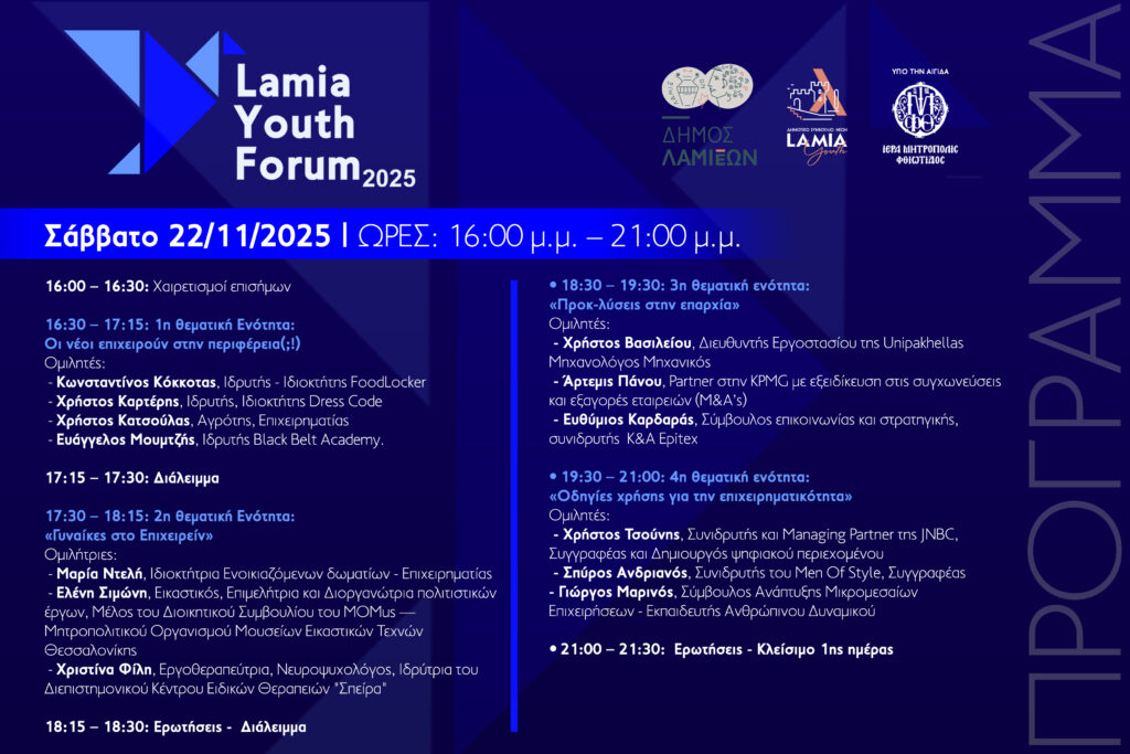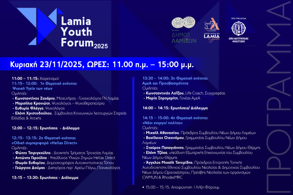 Το Συμβούλιο Νέων του Δήμου Λαμιέων διοργανώνει το διήμερο 22 Νοεμβρίου (16:00 μ.μ. – 21:00 μ.μ) & 23 Νοεμβρίου (11:00 π.μ. – 15:00 μ.μ.), στο αμφιθέατρο της Ιεράς Μητροπόλεως Φθιώτιδας, το «Lamia Youth Forum 2025».