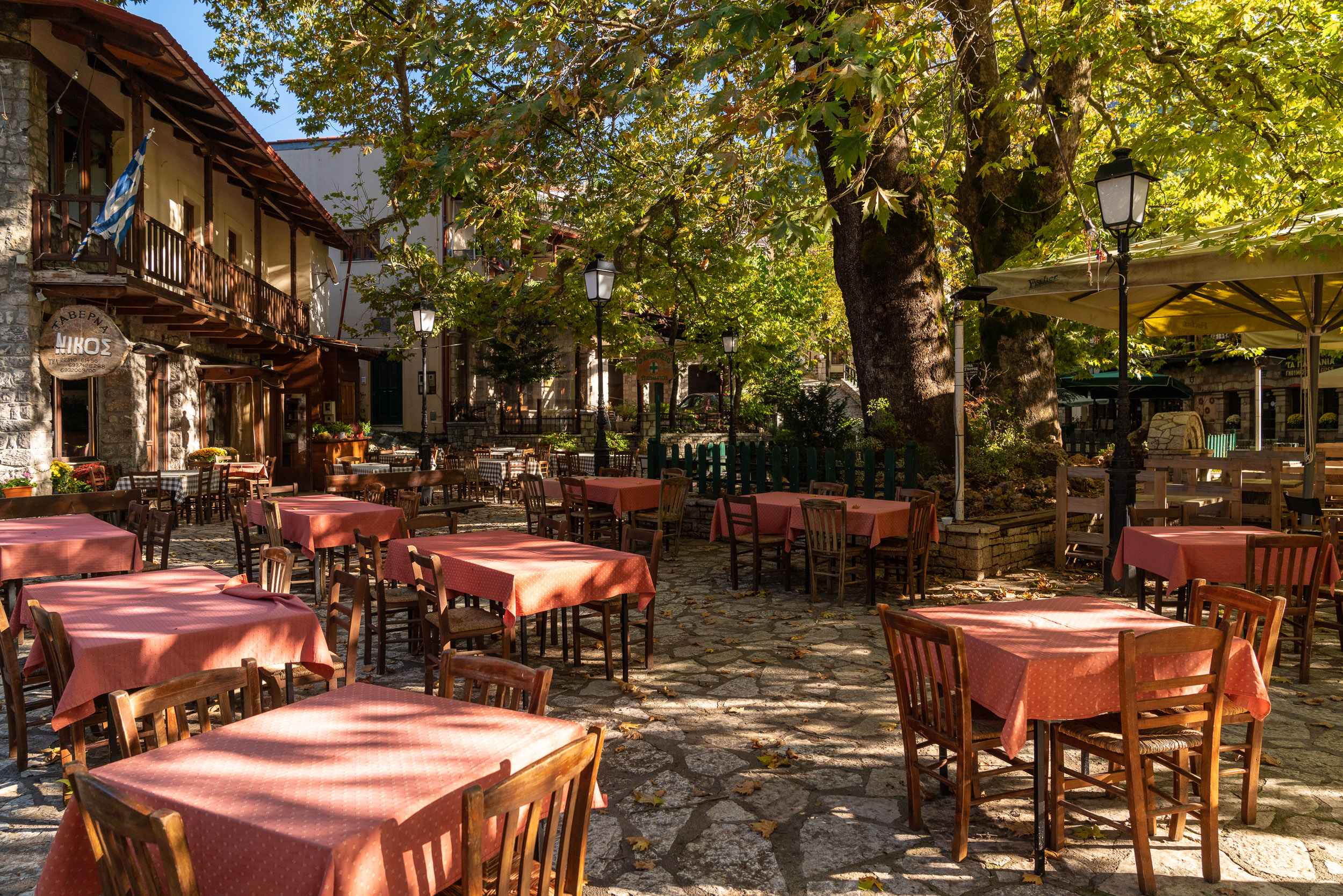 Το αυτοκίνητο μπορείτε να το αφήσετε κοντά στην είσοδο του χωριού και να περπατήσετε στα όμορφα δρομάκια του, ώσπου να φτάσετε στην πλατεία του, μικρή αλλά γεμάτη ζωή, με τις πέτρινες βρύσες, τα πλατάνια και τις μουριές. Γύρω της απλώνονται ταβέρνες και καφέ με τραπέζια κάτω από τη σκιά των δέντρων, ιδανικό σημείο για μια στάση πριν συνεχίσετε τη βόλτα σας.
